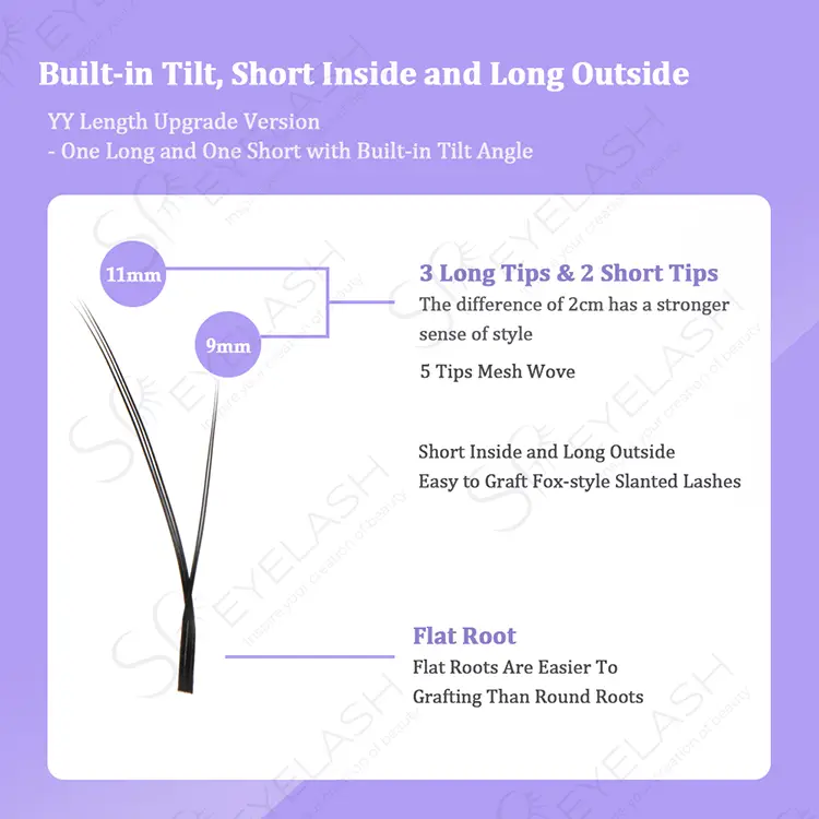 SP Eyelash Slant Flying Yy Eyelashs innovativa Fox Eye Design använder 5-punkts nätvävningsteknologi, naturligtvis förlänger ögonsvansen genom fördelningen av 3 långa och 2 korta ögonfransar. Den 0,07 mm ultra-fina fiberbasen säkerställer fluffighet utan att verka tunga, vilket ger 8-15 mm längdalternativ, i kombination med C/D/J/M/L Curl för att tillgodose olika behov från bar till tung makeup. Den unika silverfoliebasdesignen gör håravlägsnande mer bekvämt, och det matchande kortet indikerar tydligt parametrarna, vilket förbättrar effektiviteten i ögonfranssteknikernas verksamhet.